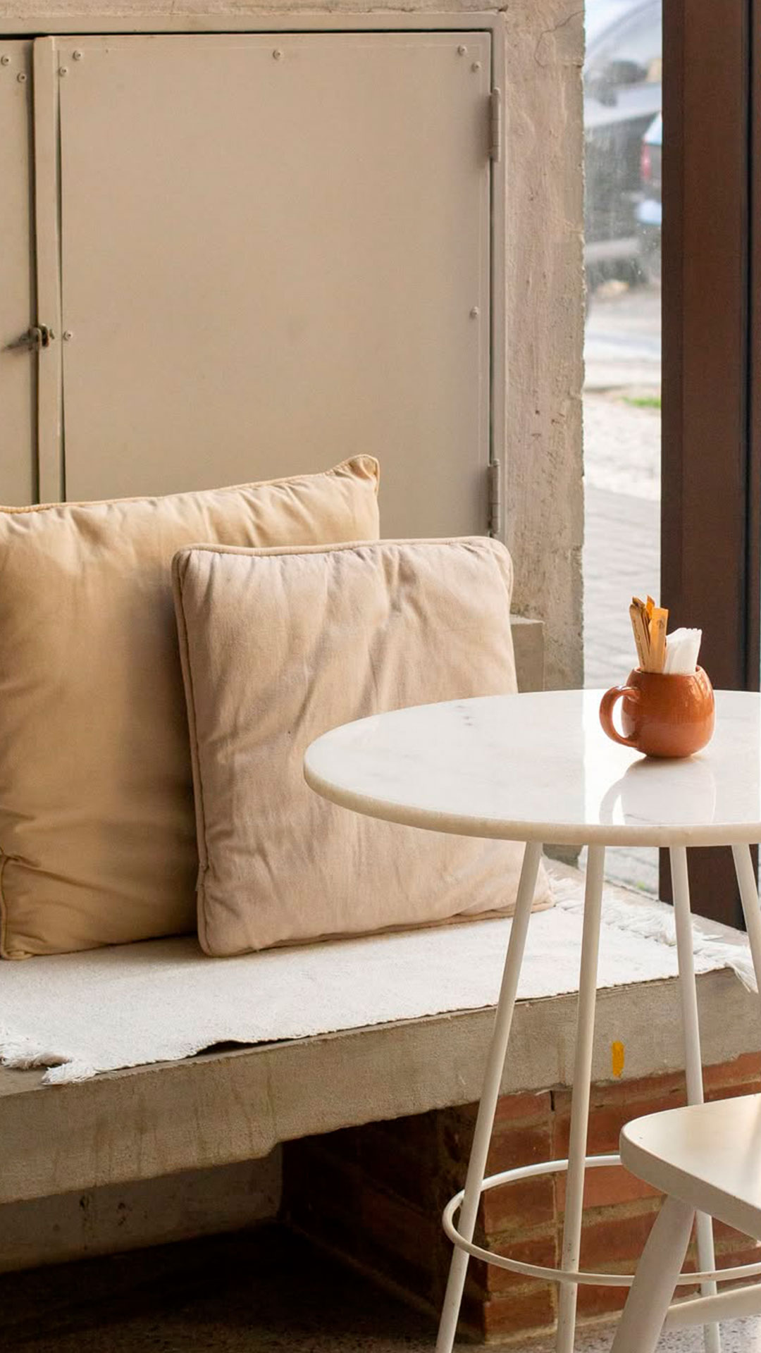 O espaço do Maz é um respiro em Botafogo, a cozinha aberta e integrada ao salão convida o cliente a participar da experiência de preparo, móveis e estantes de madeira, tijolos aparentes, cortinas de linho e iluminação baixa criam um clima acolhedor e íntimo. As mesas externas, com luz natural durante o dia e iluminação quente no fim da tarde, são perfeitas para um café prolongado, tudo ali parece dizer: “fica mais um pouco”.