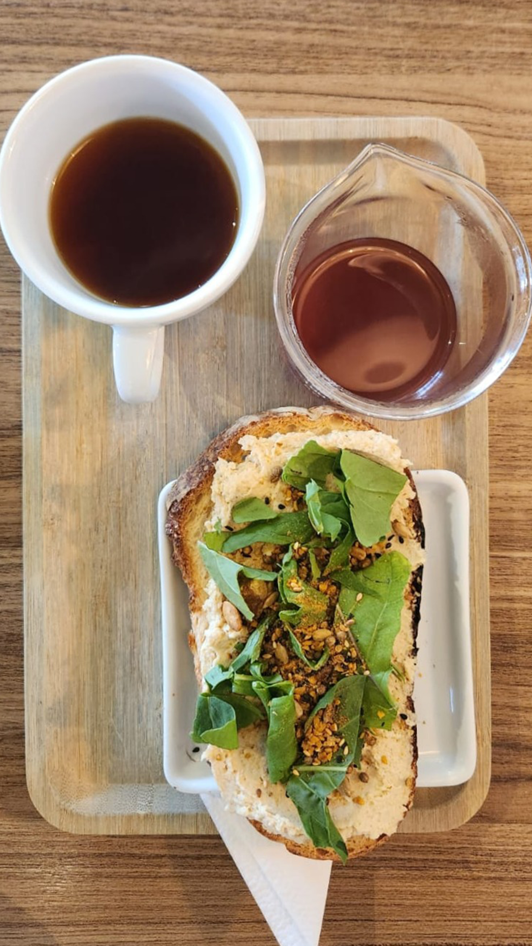 Várias opções de lanches bem completos como Focaccia Recheada, Queijo Quente e o destaque do cardápio: a Toast de Hommus e Dukkah. Esse prato foi criado pela Ana e é uma novidade no menu. A comida é de origem árabe, feita com grão de bico, e traz um toque a mais de texturas com as especiarias do Dukkah.